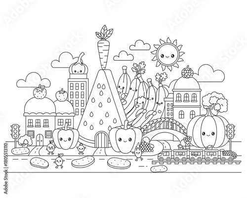 Fototapeta premium A playful city scene featuring anthropomorphic fruits and vegetables