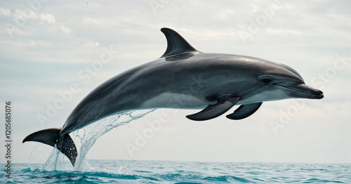 Naklejka premium A playful dolphin leaps gracefully out of the water, showcasing its agility and beauty against the serene ocean backdrop.