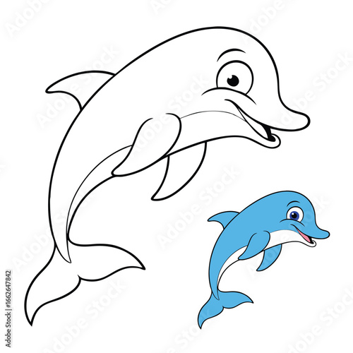 © Prasanta Saha, Fototapeta premium A playful dolphin leaps high above the waves with a big smile, creating a joyful and funny scene. Perfect as a coloring page to spark creativity and ocean fun!