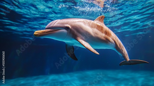 Fototapeta premium A playful dolphin swims gracefully underwater, showcasing its sleek body and bright features in a vibrant aquatic environment.