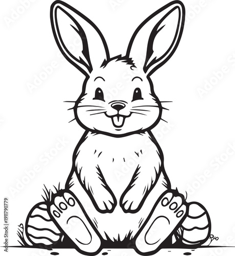 © DesignINKZ, Obraz premium A playful Easter bunny illustration, joyfully sitting among decorated eggs, celebrating the spring season and Easter traditions.