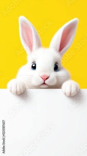 © Artemii, Fototapeta premium A playful Easter-themed design featuring a cute white bunny with fluffy fur and bright eyes peeking over a blank white banner