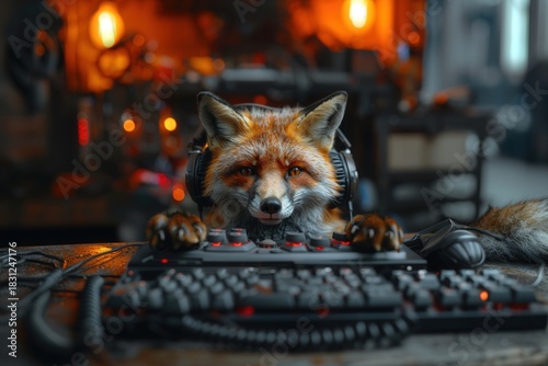 © Miramiska, Obraz premium A playful fox is engrossed in typing on a computer keyboard while wearing headphones. This image evokes a sense of modern fun and connection.