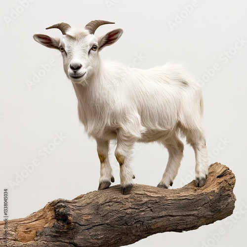 © Thanthara, Obraz premium A playful goat standing on a log, curious stance, soft fur detailed, three-quarter angle, white backdrop