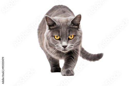 © Oratai, Obraz premium A playful gray cat with a sleek coat and bright yellow eyes, a white backdrop