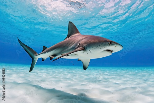 © Michael, Fototapeta premium A Playful Hammerhead Shark Swimming in a Vivid White Expanse