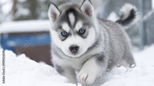 Naklejka premium A playful Husky puppy tumbles in the snow, its fluffy tail wagging furiously...