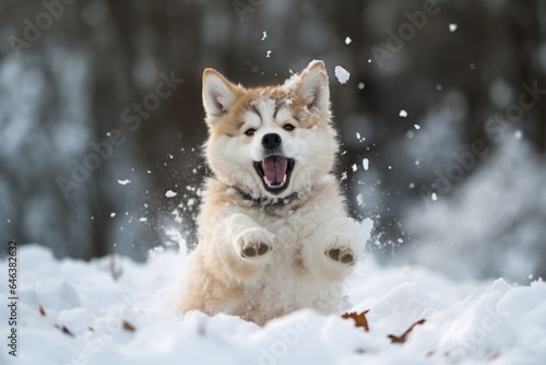 Naklejka premium a playful husky trying to catch its tail in the snow