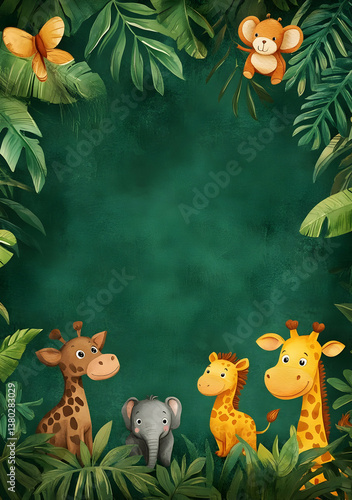 Fototapeta premium A playful illustration featuring a giraffe, elephant, and monkey among tropical foliage.