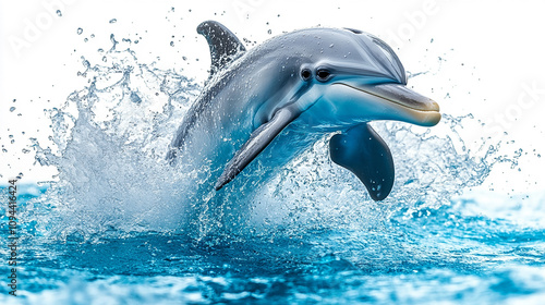 © Tabinda, Naklejka premium A playful, light-blue dolphin leaps out of water, surrounded by splashes.