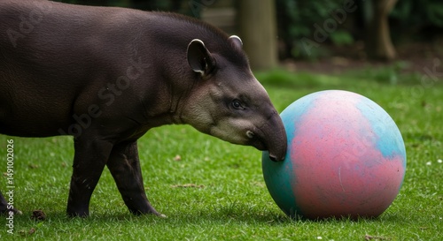 Fototapeta premium A playful malayan tapir interacts with a large colorful ball in a lush green...