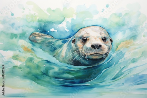 © PinkiePie, Obraz premium A playful otter floating on its back, with a watercolor background featuring shades of blue and green to create the illusion of water