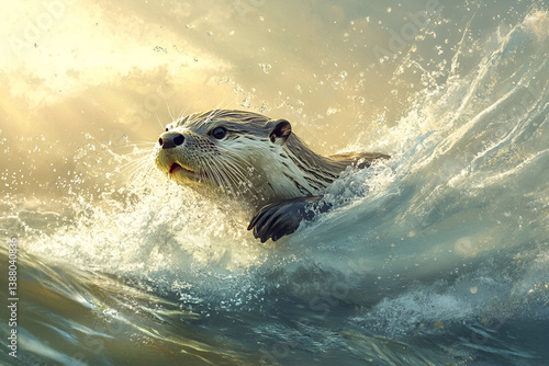© Nature_Stock, Obraz premium A playful otter tumbling through the river's current, its fur glistening under the sunlight as it splashes through the water, creating frothy waves