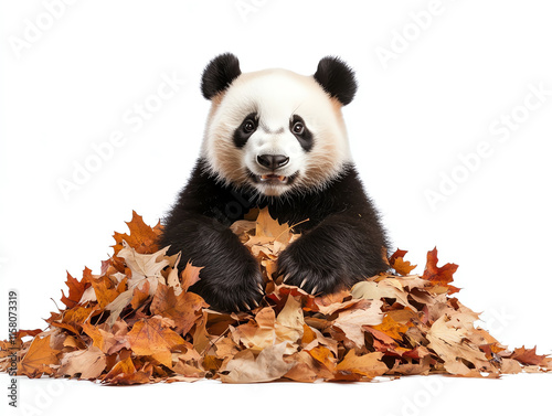 Naklejka premium A playful panda surrounded by a pile of colorful autumn leaves, showcasing...