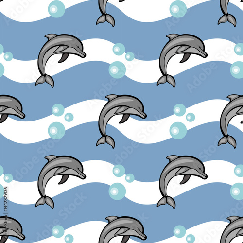 Naklejka premium A playful pattern featuring dolphins swimming against a blue background, with white waves and bubbles. The design is cheerful and suitable for children's decor or aquatic-themed projects.