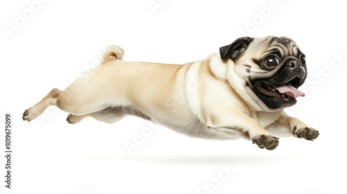 © BerkahStock, Obraz premium A playful pug dog leaping joyfully in mid-air against a white background.