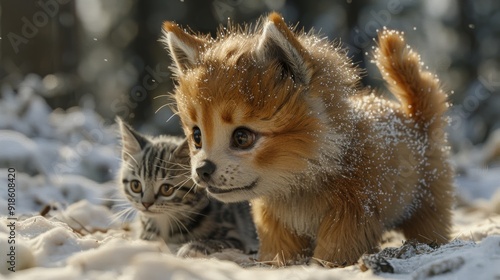 © Рудой Максим, Naklejka premium A playful puppy and kitten explore snow-covered ground in a winter forest setting