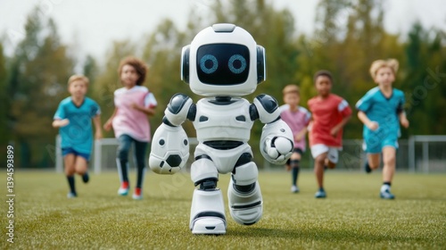Fototapeta premium A playful robot leads children running on a soccer field, blending AI and...