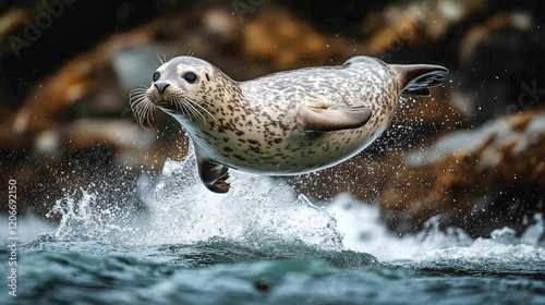 Obraz premium A playful seal diving into the ocean from a rocky shoreline, its body curved...