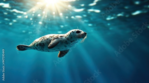Naklejka premium A playful seal gracefully swims underwater, illuminated by soft sunlight...