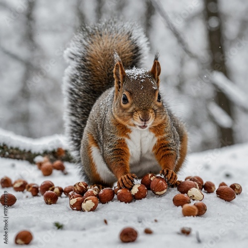 © Muhammad, Obraz premium A playful squirrel gathering nuts on a white background.