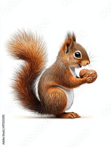© Chano_1_na, Obraz premium A playful squirrel holding a nut, showcasing its vibrant fur and curious expression against a clean white background.