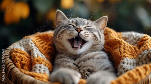 Naklejka premium A playful tabby cat with its mouth open in a wicker basket covered by a knitted blanket.