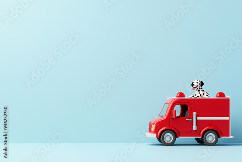 Fototapeta premium A playful toy fire truck with a dog perched on top, set against a...