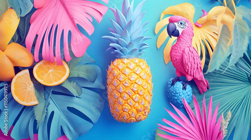 © Volkan, Naklejka premium A playful tropical patchwork with cartoon pineapples parrots and oversized palm leaves in cheerful pastel and neon shades.