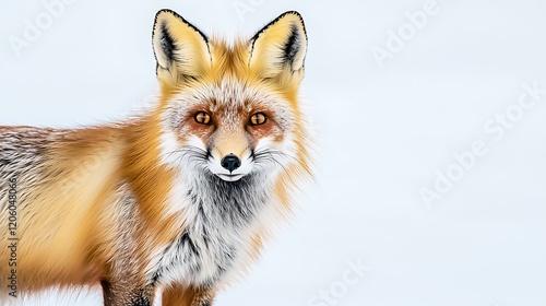 © WINGGOD, Obraz premium A playful yet intense close-up of a red fox, its amber eyes captivating as it stares forward on a pure white background