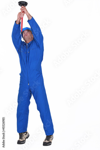 Naklejka premium A plumber unplugging the ceiling.