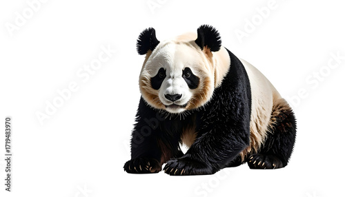 © Minji, Naklejka premium A plump giant panda sits against a stark black background, its thick, black-and-white fur contrasting sharply. Its expression is calm and gentle