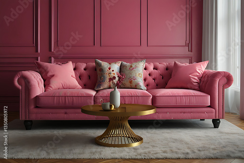 © Areej, Naklejka premium A plush pink chesterfield sofa adorned with decorative pillows