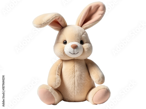 Obraz premium A plush toy rabbit sitting peacefully on a clean white background, suitable for various commercial uses