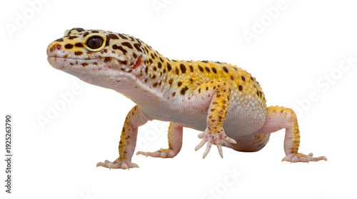 Obraz premium a png image featuring a leopard gecko with its natural yellow, white, and black spotted pattern, presented isolated on a transparent background for versatile design use.