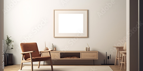 Obraz premium A PNG mockup frame, featuring a clear background, is elegantly displayed on the wall of a living room, providing a customizable element for showcasing artwork. Photorealistic illustration