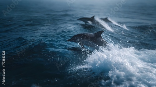 Naklejka premium A pod of dolphins leaps energetically from the dark choppy ocean waves