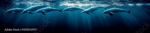© Alexey, Obraz premium A pod of dolphins moving in unison under the glowing sunlight in a deep blue ocean. Generative AI