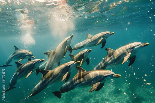 © Lucianastudio, Obraz premium A pod of dolphins playfully swimming in unison, creating mesmerizing patterns in the sparkling azure water, with the ocean floor visible beneath