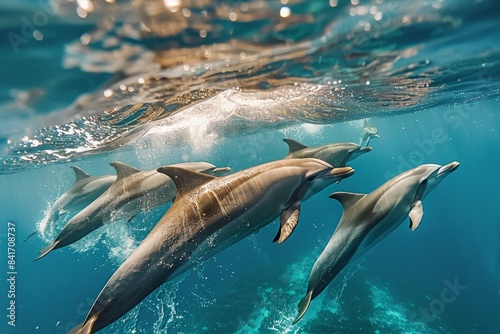 © Lucianastudio, Obraz premium A pod of dolphins playfully swimming in unison, creating mesmerizing patterns in the sparkling azure water, with the ocean floor visible beneath