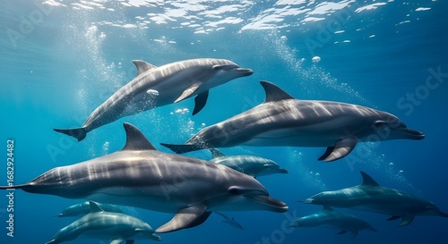 Obraz premium A pod of dolphins swims together in clear blue ocean waters, bubbles rising...