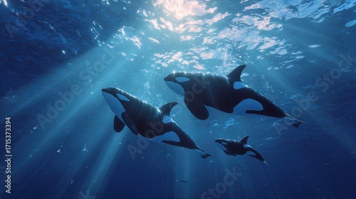© Vectune, Fototapeta premium A pod of orcas gracefully swims through the sundrenched ocean, their sleek bodies cutting through the clear blue water