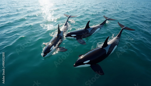 © abu, Obraz premium A pod of orcas swims gracefully through lightly rippled ocean waters under a clear sky.