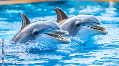 Naklejka premium A pod of playful dolphins leaps joyfully through the crystal-clear, azure sea, their sleek bodies glistening in the sunlight