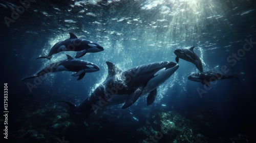Obraz premium A pod of sleek orcas gliding effortlessly through the dark depths of the ocean.