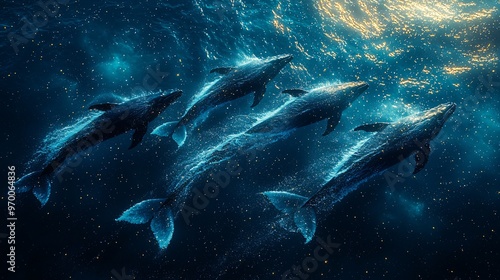 © Vladimir, Fototapeta premium A pod of whales breaking through the surface of the ocean
