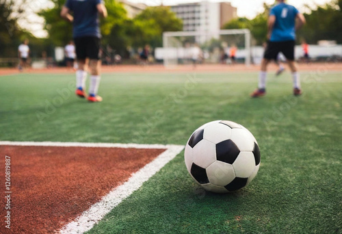 Fototapeta premium A point-of-view shot of a street soccer game with players of different ages...