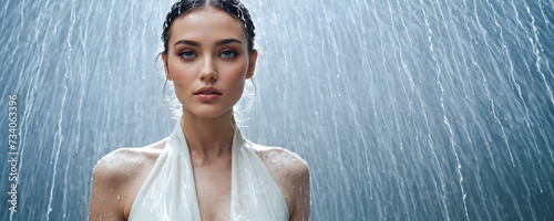 © vladnikon, Obraz premium A poised fashion model stands gracefully while a unique rain of milk cascading down creates a whimsical and ethereal effect, highlighting the delicate features of her attire