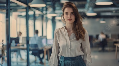 Fototapeta premium A poised woman in a contemporary office setting exudes confidence and professionalism as she gazes forward, epitomizing modern work culture.