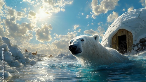 Naklejka premium A polar bear swimming in an icy stream near an igloo, its wet fur glistening as the sunlight breaks through the scattered clouds above. 32k, full ultra hd, high resolution
